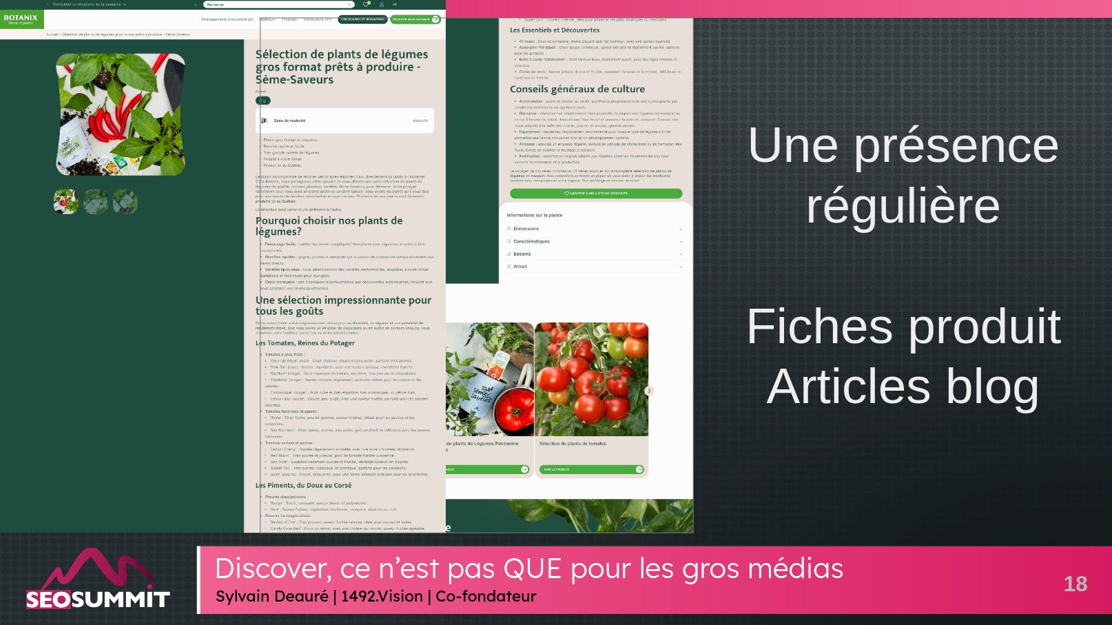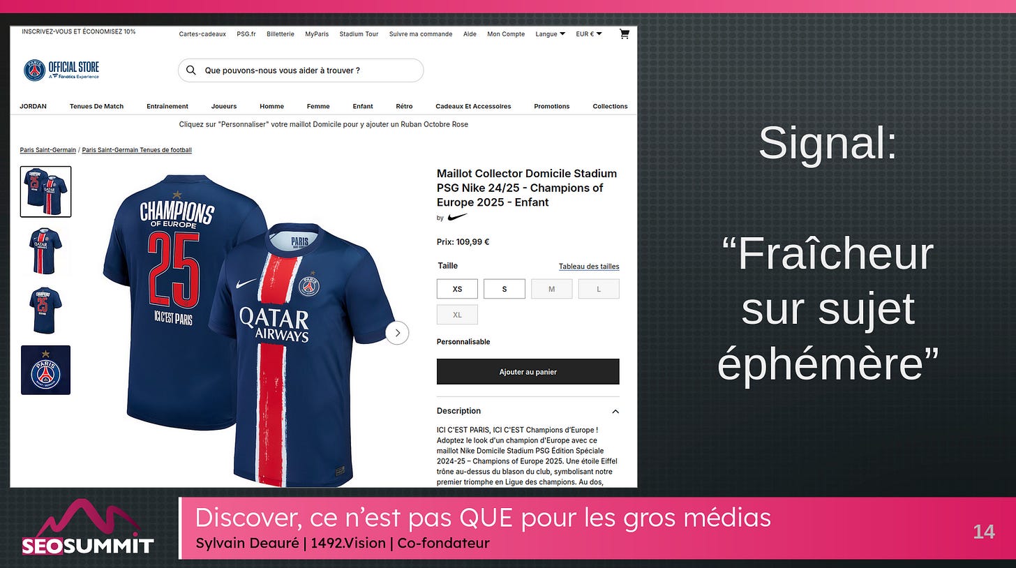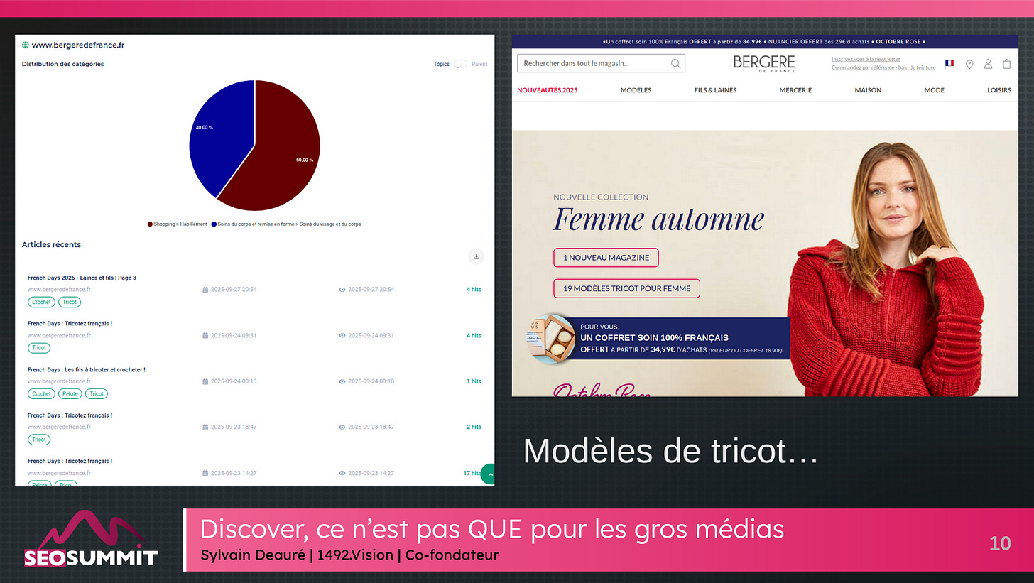 Lors du SEO Summit 2025 au Parc des Princes, nous avons partagé des cas concrets d’e-commerces qui performent sur Discover. Pas des théories : des données réelles, des fiches produit qui poppent.