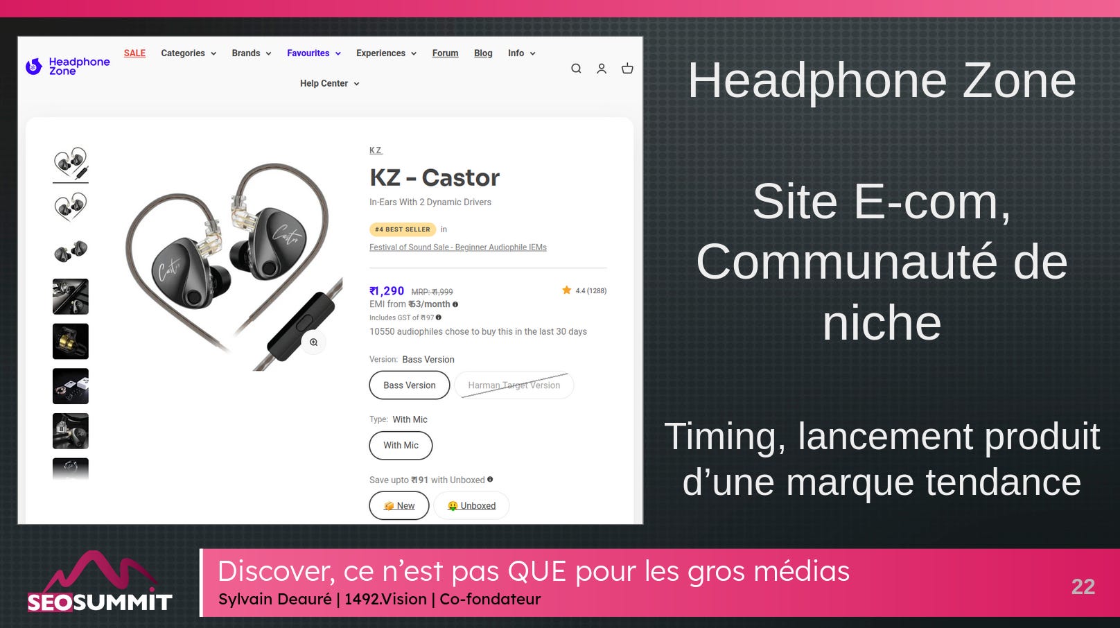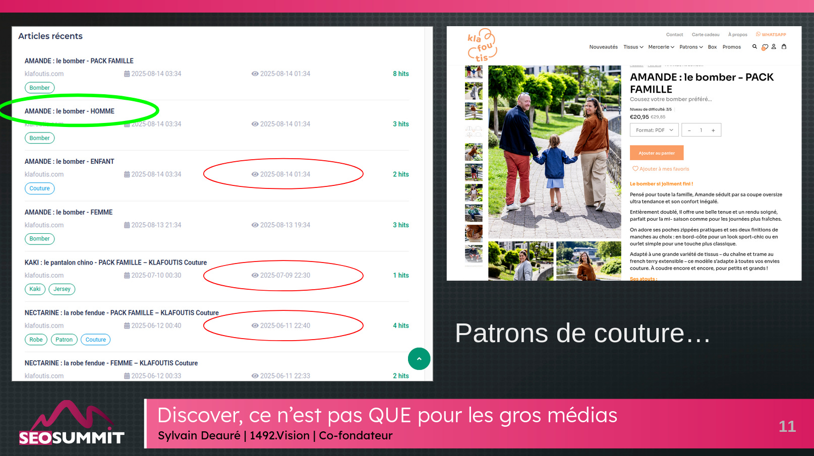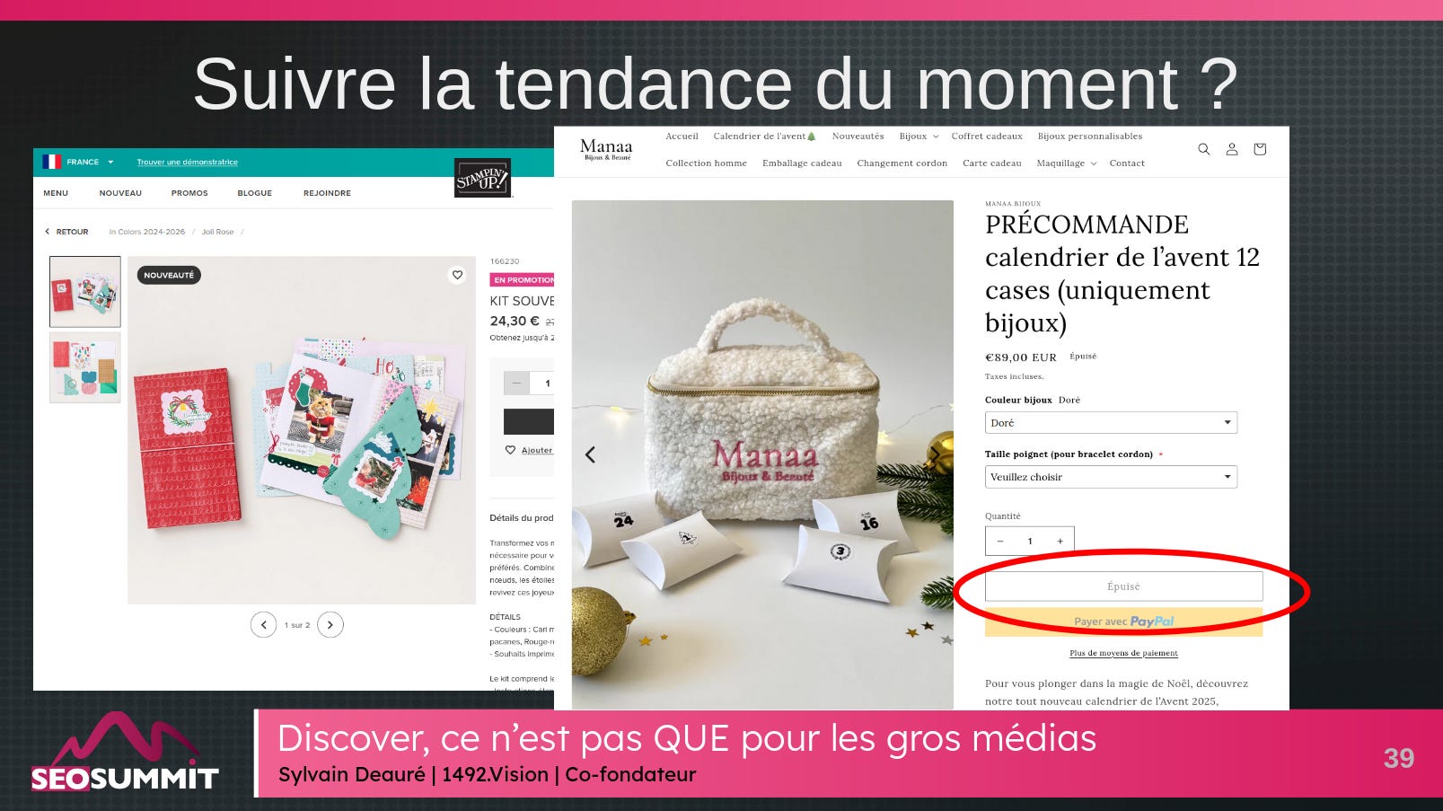 Lors du SEO Summit 2025 au Parc des Princes, nous avons partagé des cas concrets d’e-commerces qui performent sur Discover. Pas des théories : des données réelles, des fiches produit qui poppent.