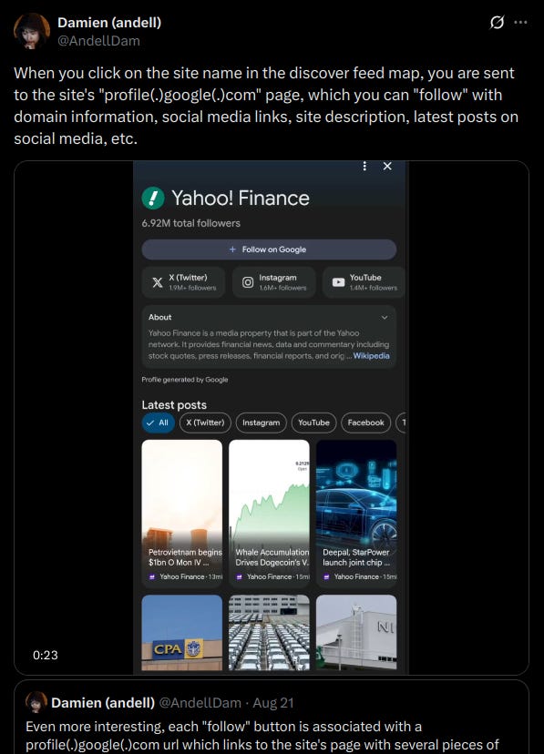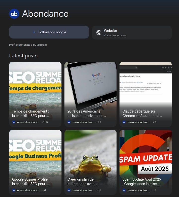 On peut penser que ce profile pourrait s'étoffer, devenir l'équivalent de l'ancien profile "Publisher Center", et devenir un hub pour redistribuer des clics depuis l'écosystème Discover, pour compenser les pertes des AIOs...