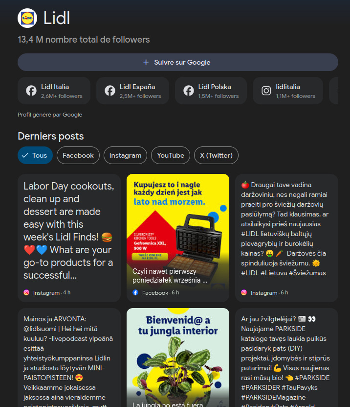 Et en dessous, un flux avec les derniers posts du média, que l'on peut filtrer par Réseau social.