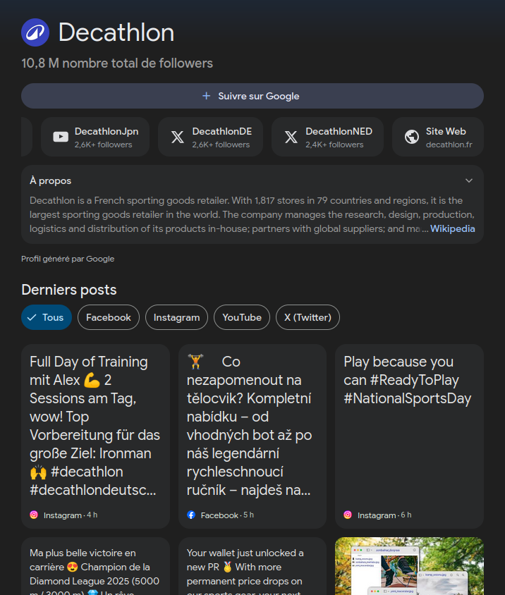 Quand l'entité est liée à une fiche Wikipédia (cf Decathlon), un petit encart.